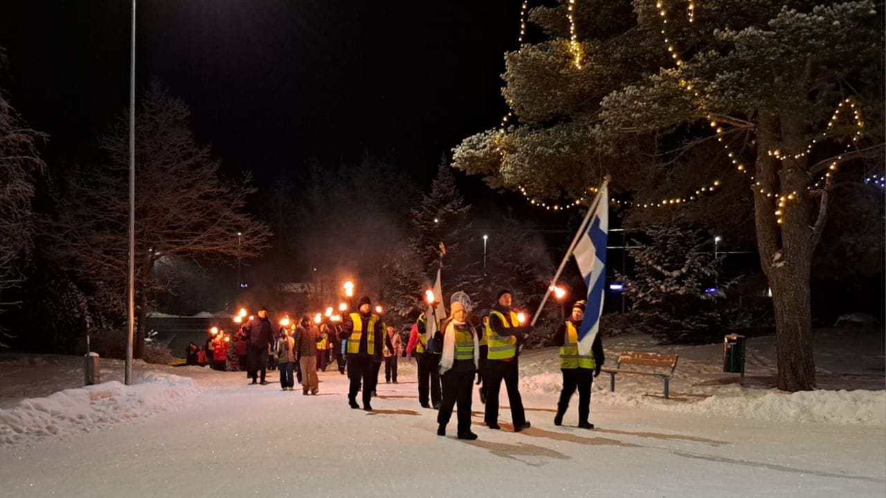 Perinteikäs ja juhlallinen soihtukulkue itsenäisen Suomen kunniaksi Ryttylän koululta kirkolle.